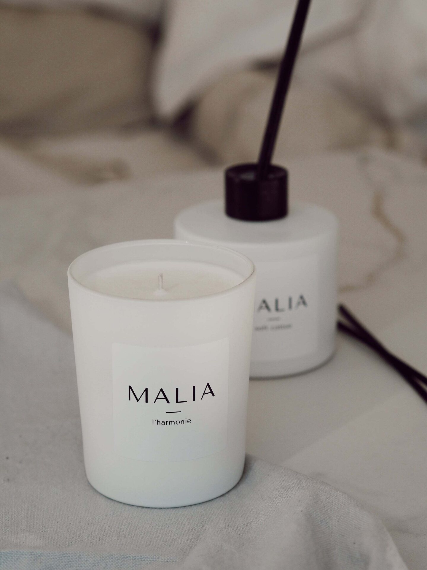 Luxury candles are hand crafted in France out of natural soy wax that is sustainably sourced from the USA and use cotton wicks. To optimise the scent and texture of Malia candles, the wax mixture contains a little bit of coconut wax and beeswax.