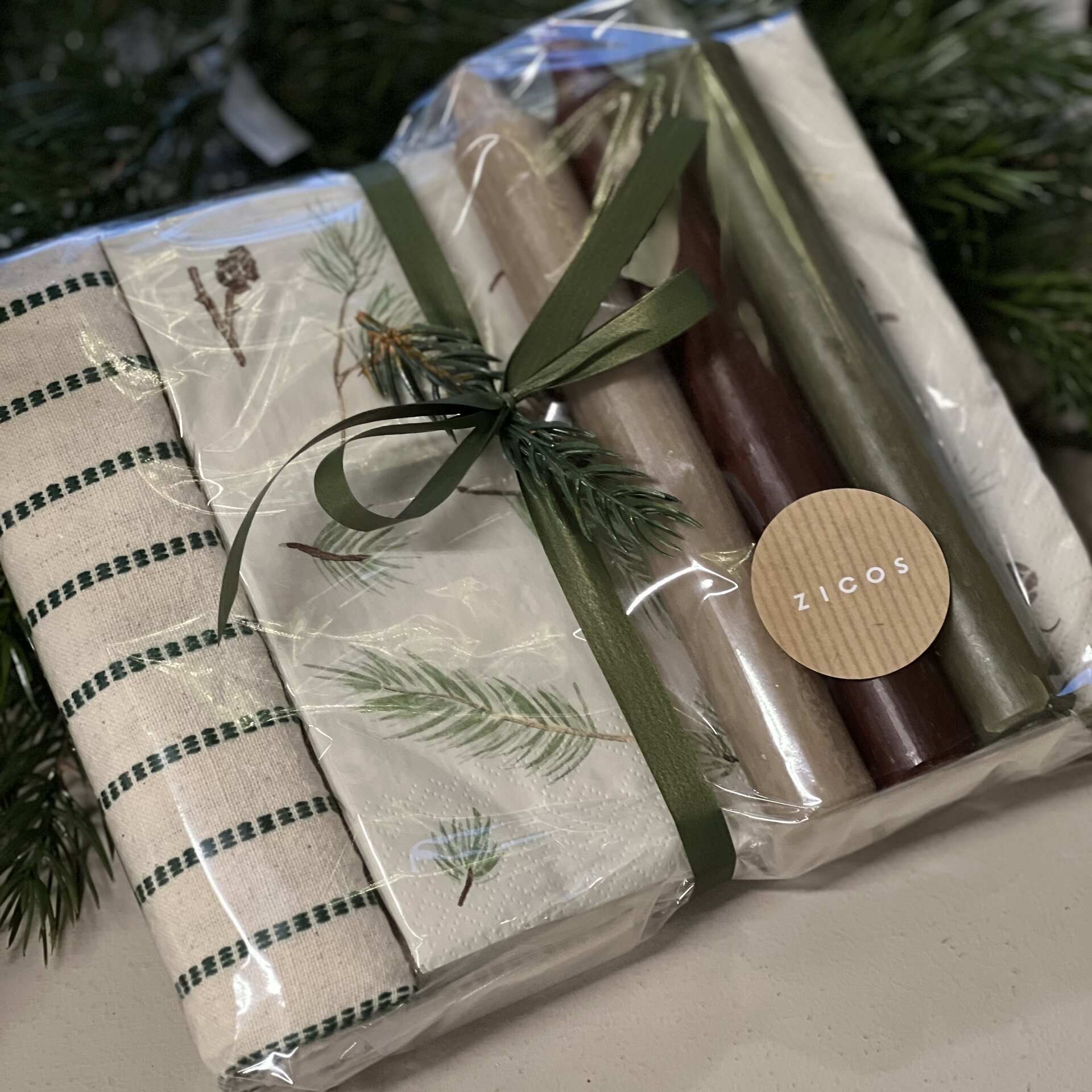 Kaunis sellofaaniin kääritty lahjapakkaus, jossa on Orla keittiöpyyhe, havu/käpyservetit sekä 3 kpl läpivärjättyjä kruunukynttilöitä väreissä pellava, ruskea ja metsänvihreä.