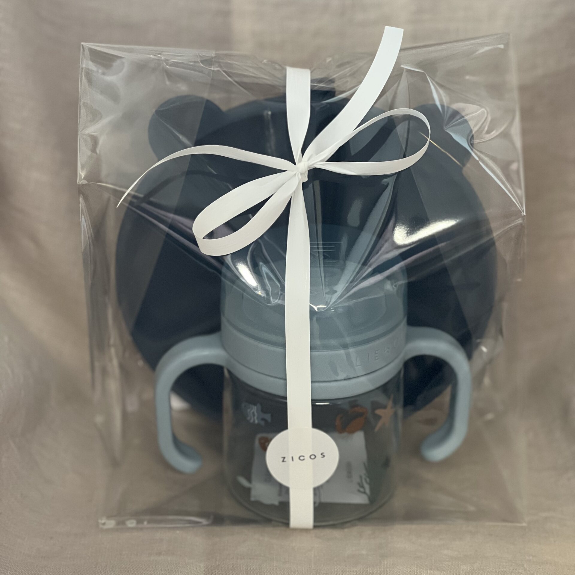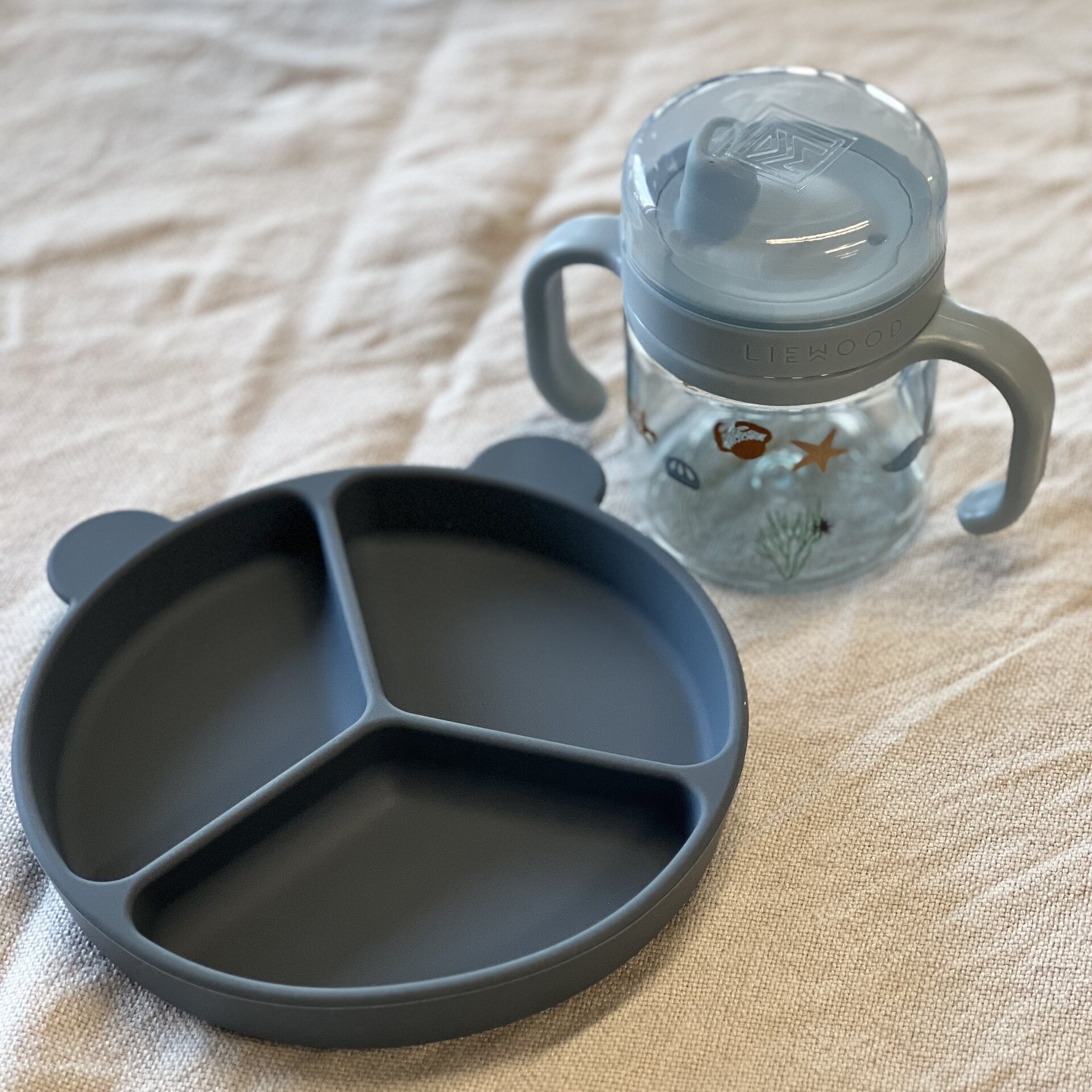 Lahjapakkauksessa tulee äitien hehkuttama Liewoodin Stacy lautanen whale blue sävyssä sekä Kylo nokkamuki sea creature/sandy sävyssä.