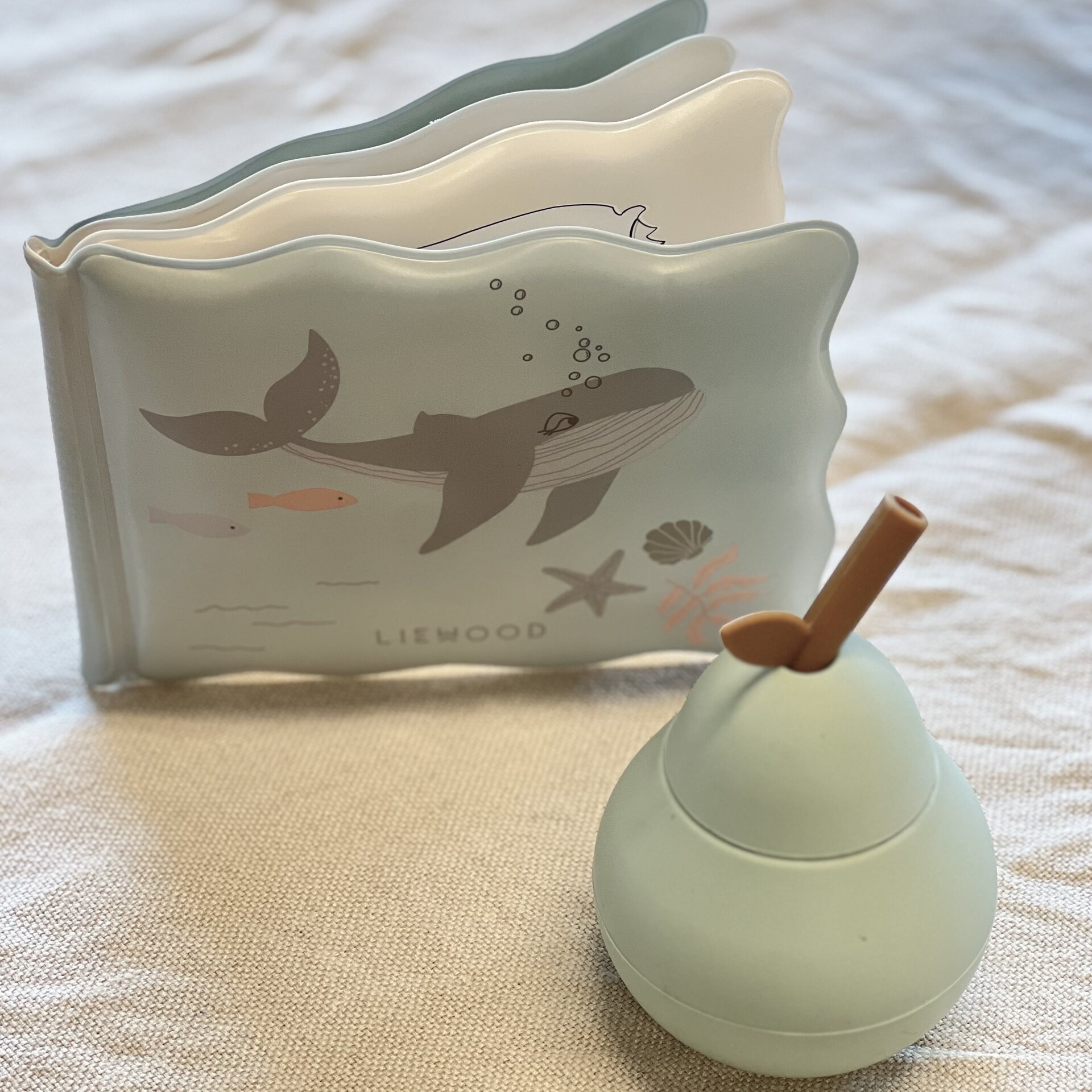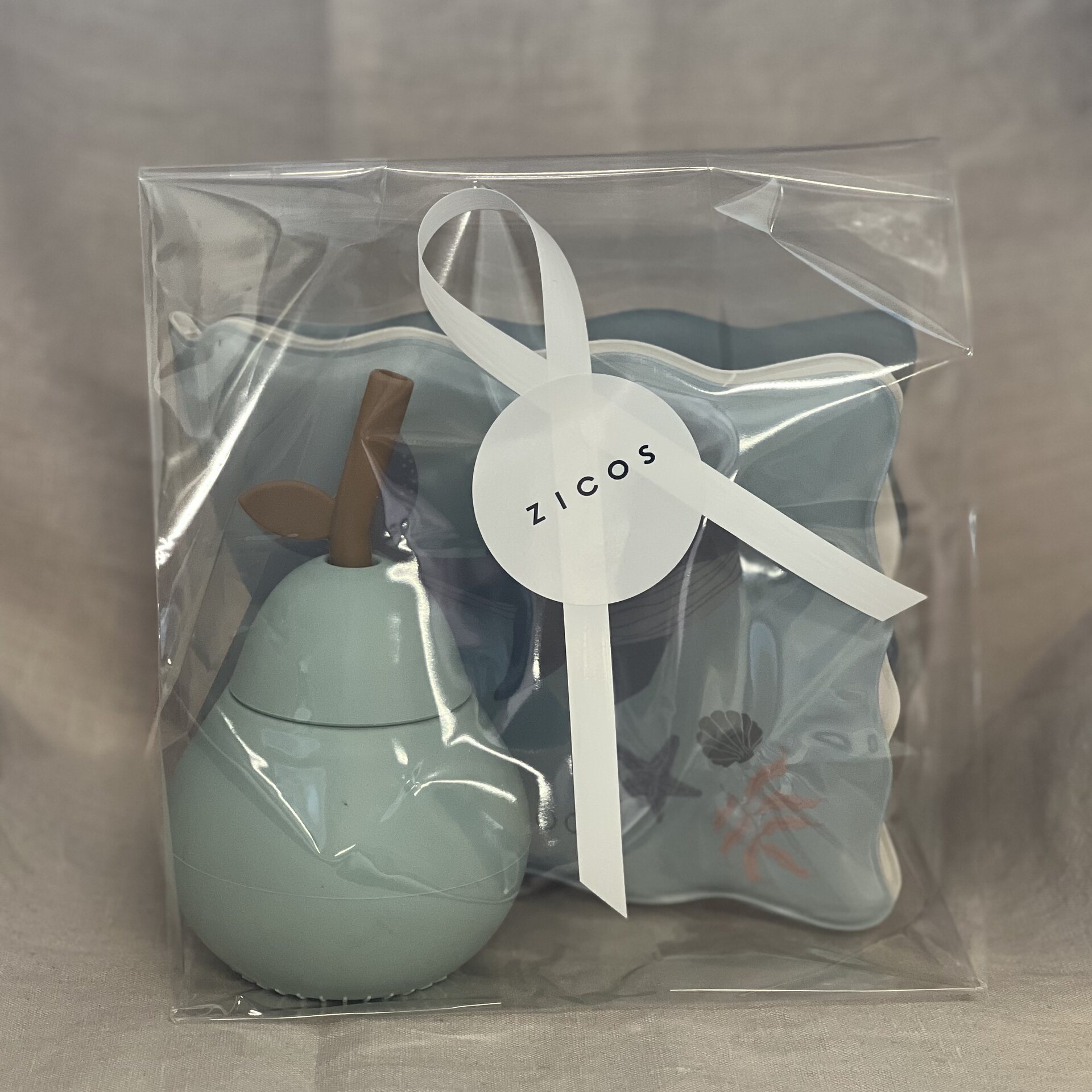 Lahjapakkauksessa tulee OYOY:n silikoninen päärynän mallinen pillimuki sekä meriaiheinen vesivärityskirja.