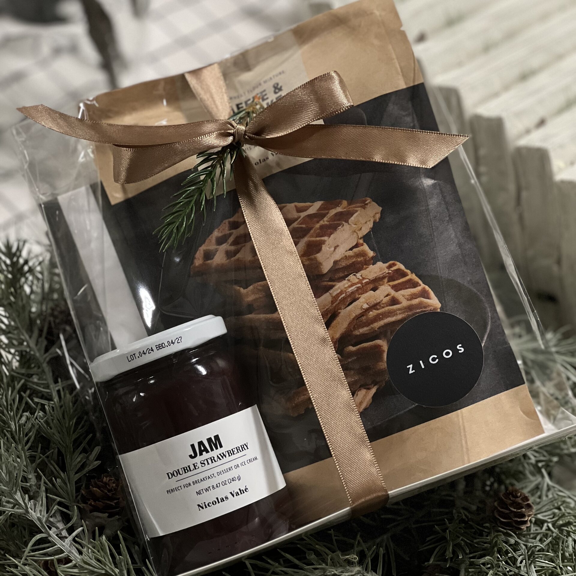 Vohveliseos, mansikkahillo ja servetit lahjapakkaus