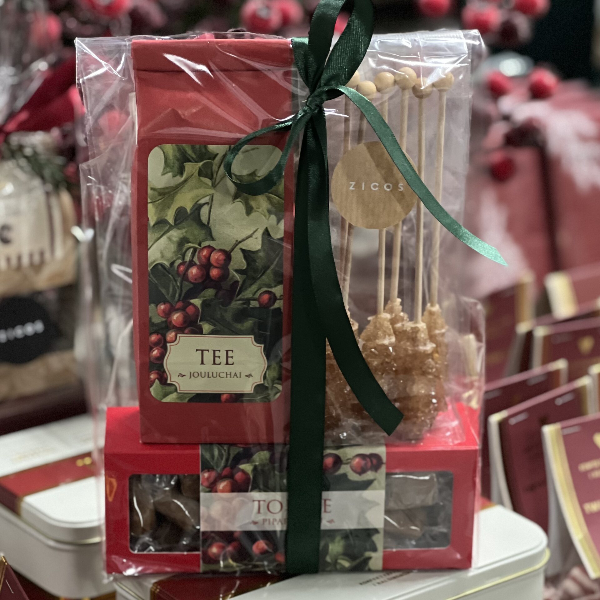 Tämä herkkulahja sisältää tuoksuvaa, mustaa jouluteetä ja piparkakun makuista toffeeta ihanan jouluisissa pakkauksissa. Mukana on myös ruokosokerista valmistetut kandisokeritikut, jotka ovat kuin lusikallinen makeaa kuuman juoman seurana. Kiteytetty ruokosokeri kauniissa puutikussa näyttää ruskealta kristallilta.