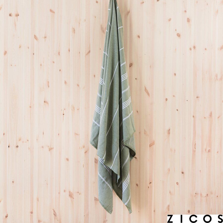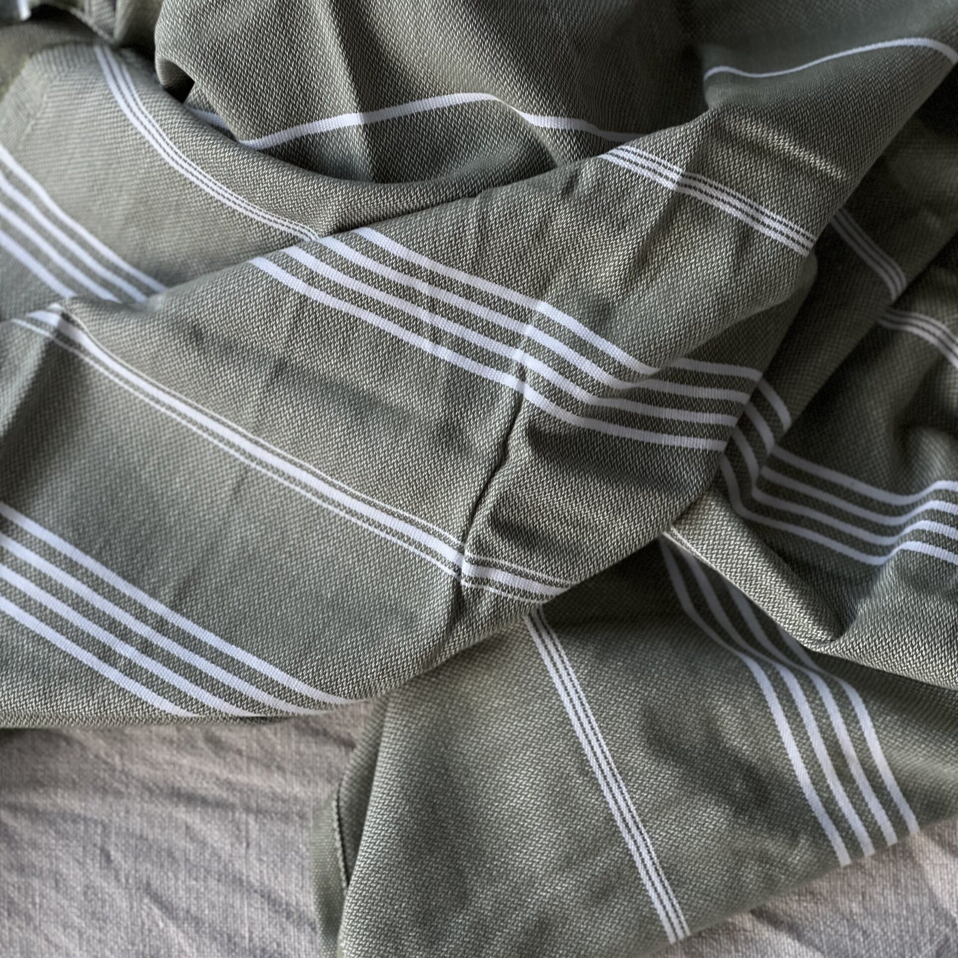 Tyylikäs oliivin ja valkoisen sävyinen Ranta SAUMATTU -malli tuo raikasta ilmettä kylpyhetkiin. Hamam-pyyhe toimii erinomaisesti myös piknik-alustana tai kevyenä kesähuivina.