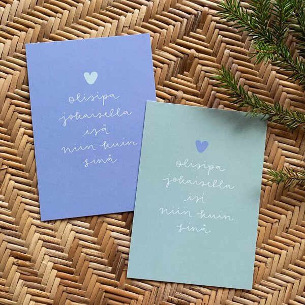 Koko A6. Painettu 300g ympäristösertifioidulle paperille Iisalmessa. Osoiteviivat kääntöpuolella.