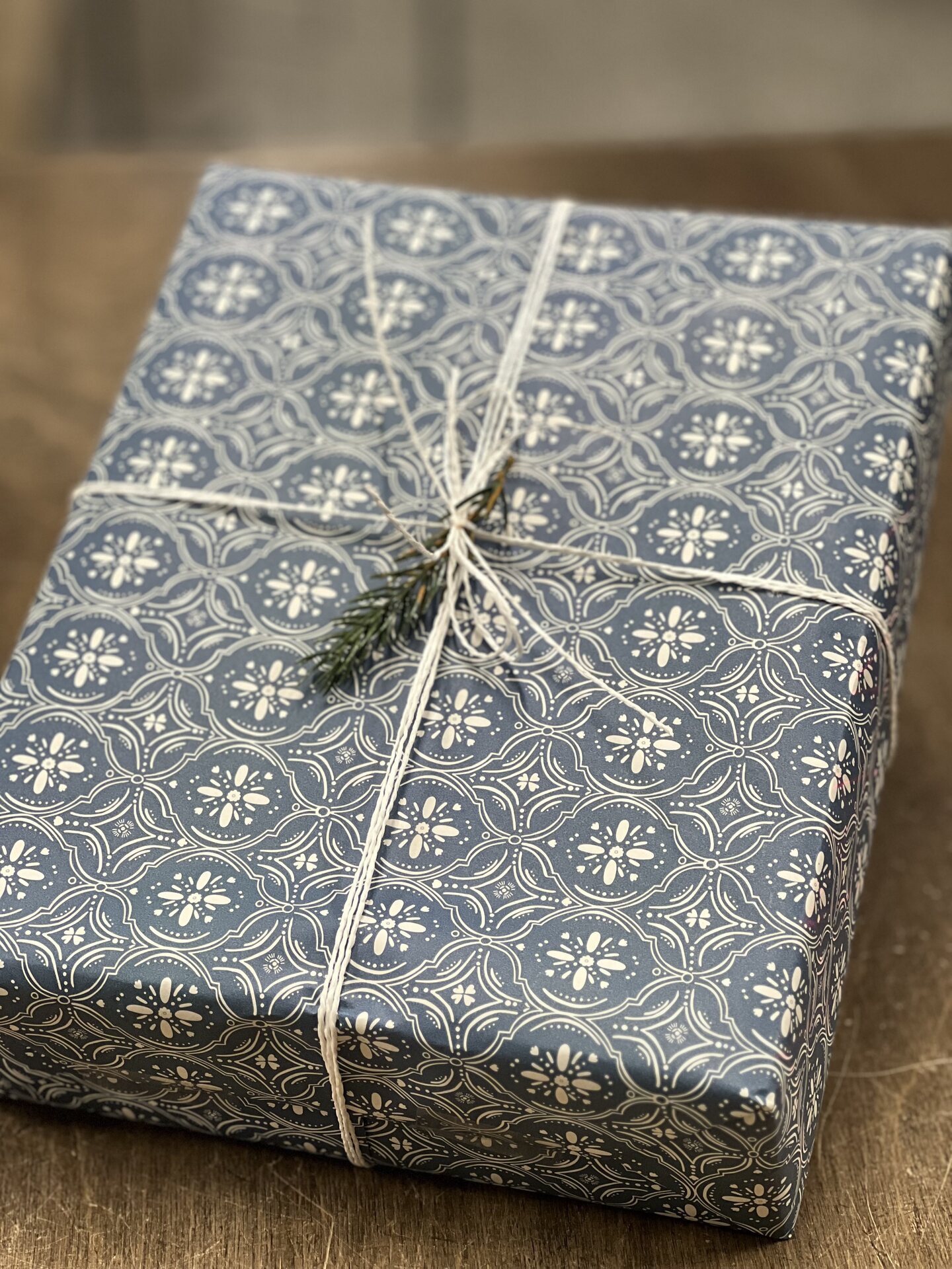 Ib Laursenin ornamenttikuvioinen Blue tile-lahjapaperi tuo mieleen sinivalkoiset kaakelilaatat. Tukeva ja läpinäkymätön 100% kierrätysmateriaalista valmistettu lahjapaperi ei paljasta lahjaasi etukäteen.