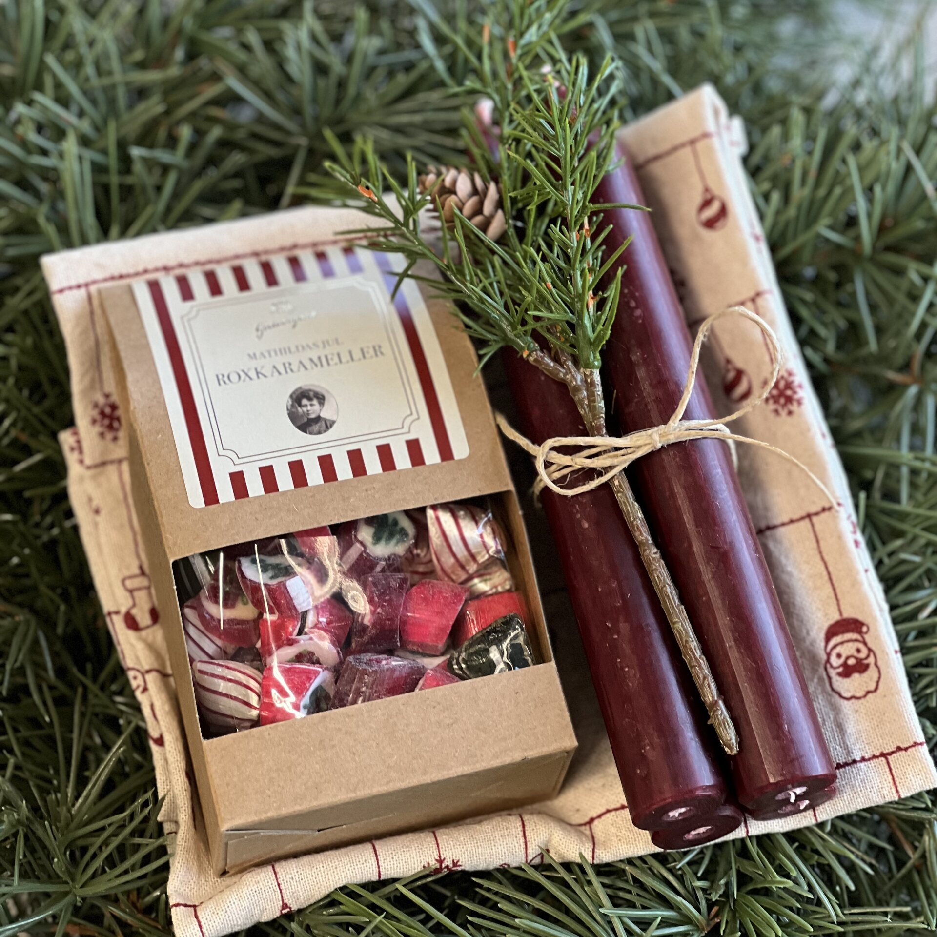 Kaunis sellofaaniin kääritty lahjapakkaus, jossa on Hollie keittiöpyyhe, 4 kpl viininpunaisia kruunukynttilöitä, paketti herkullisia karamelleja ja aidonnäköinen havu.
