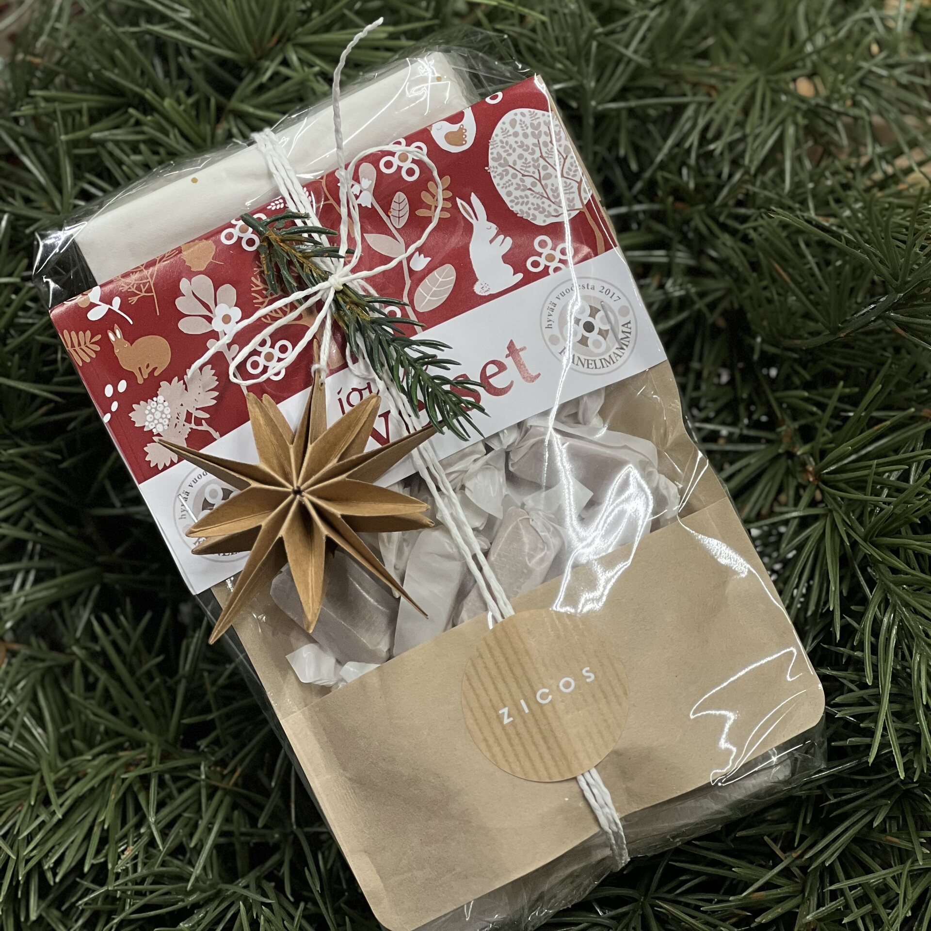 Tämä jouluinen lahjapakkaus sisältää pussillisen Kanelimamman perinteisiä voitoffeita sekä jouluiset servetit. Kauniisti sellofaaniin pakatun pikkulahjan somisteena on ripustettava Stella-paperikoriste. Tämä lahkapakkaus ilo antaa ja saada joulutervehdyksenä.