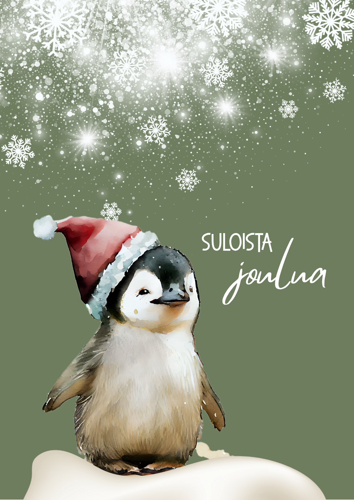 Tässä hurmaavassa joulukortissa seikkailee pingviini tonttulakki päässä lumisateessa. 1-osaisen joulukortin etupuolella on toivotus "suloista joulua" ja kääntöpuolella on osoiterivit.