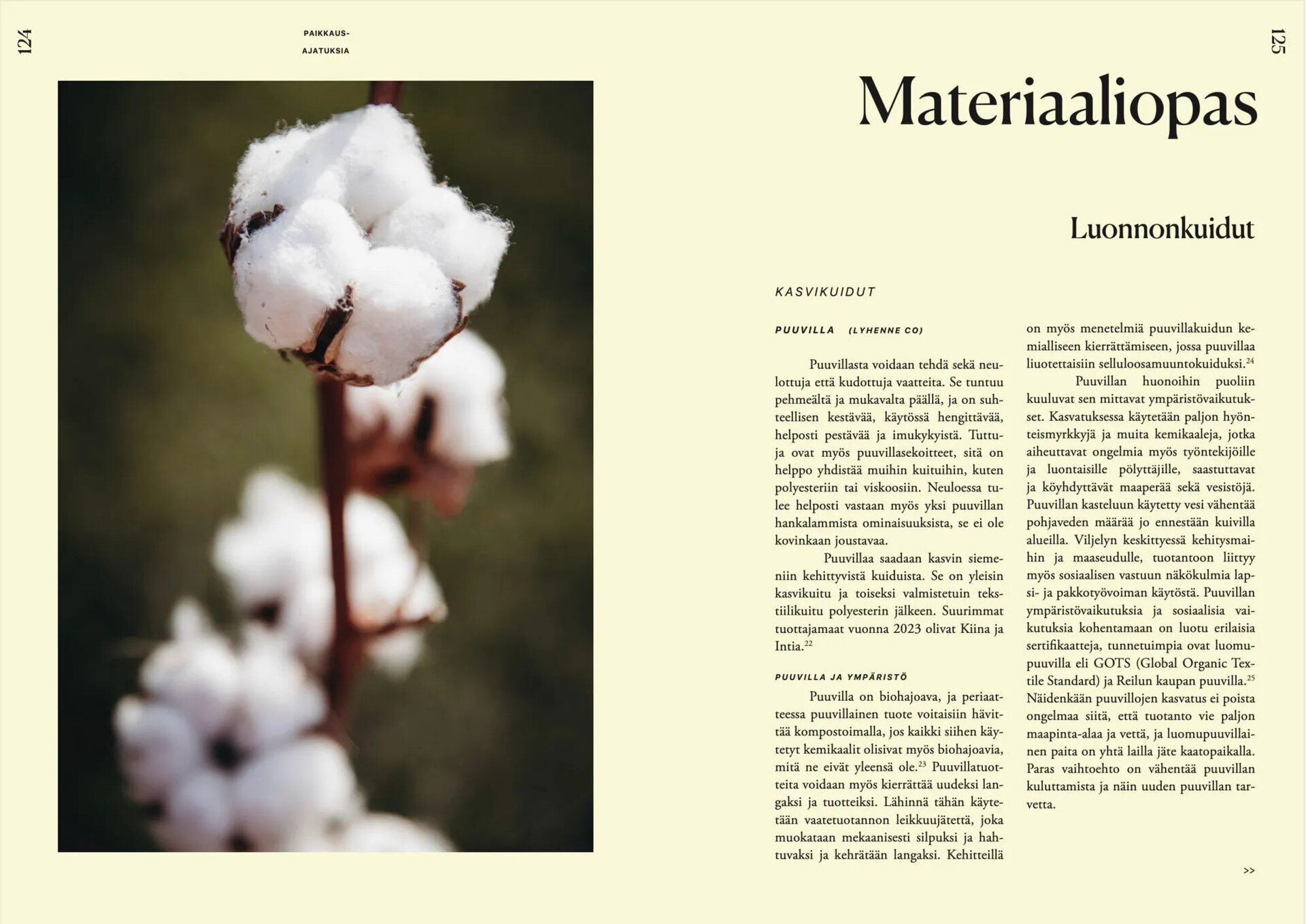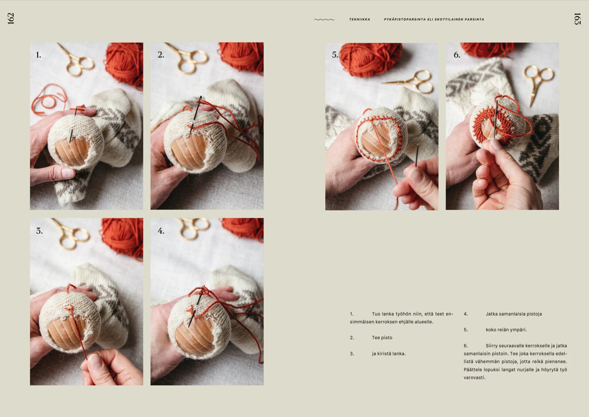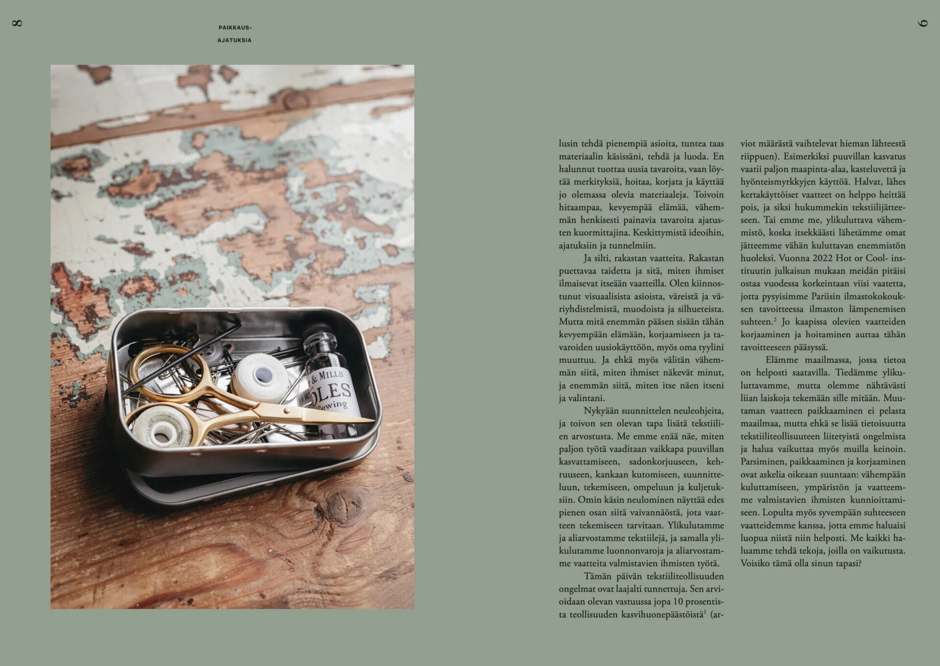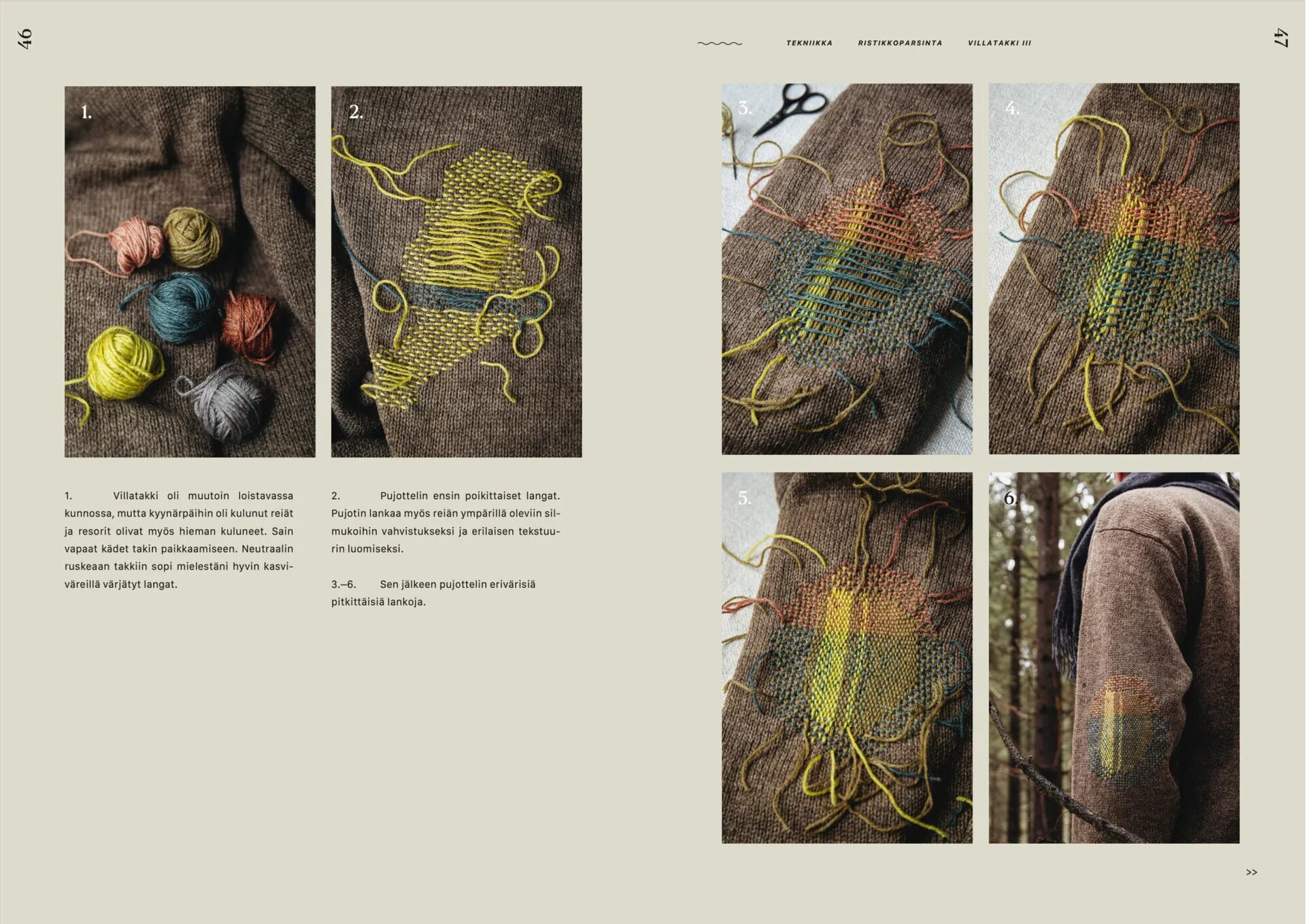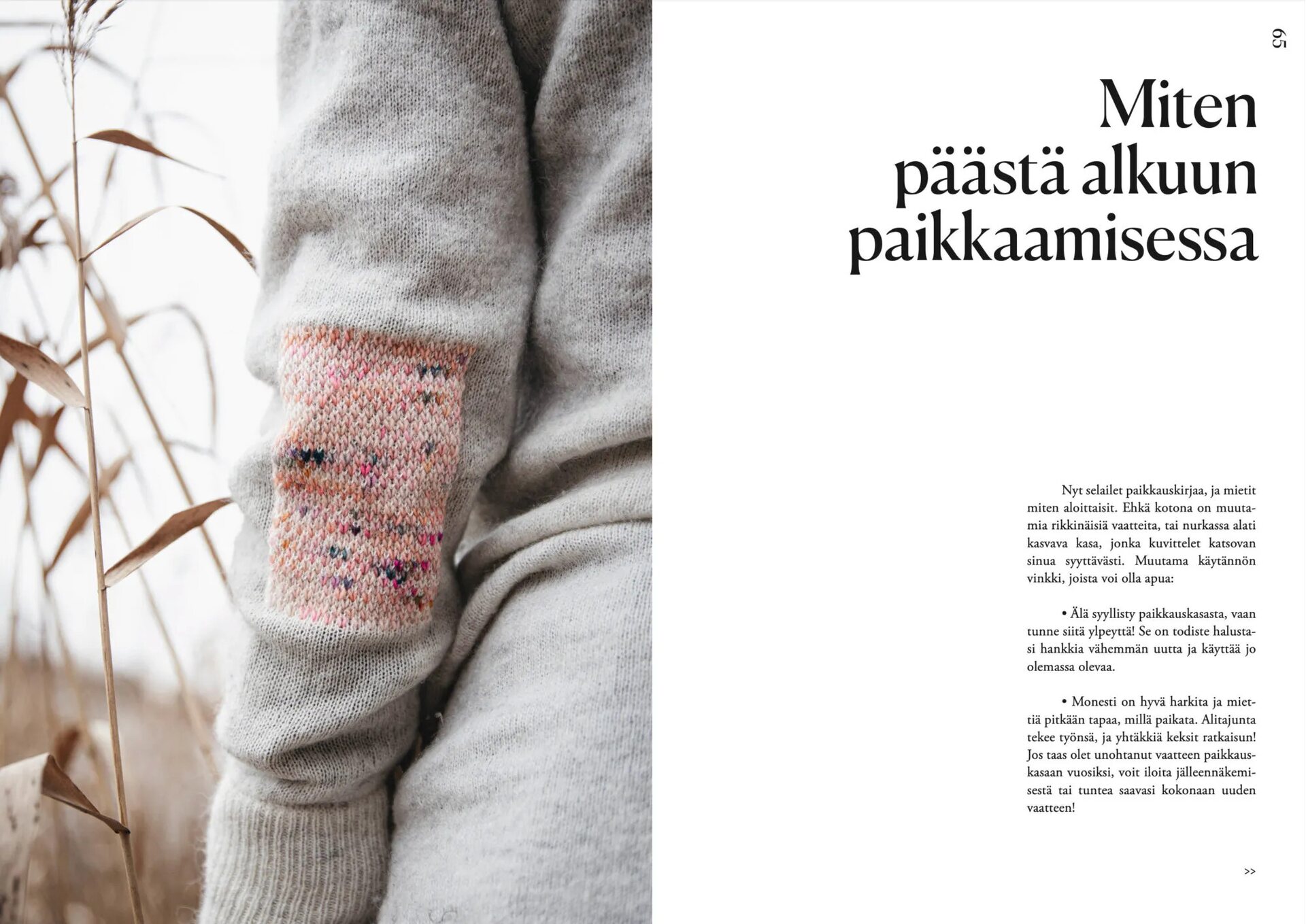 Paikkausajatuksia -kirja keskittyy paikkauksen taitoon, joka parhaimmillaan korjaa vaatteiden lisäksi meitä itseämme ja ympäristöämme. Kirja kannustaa huolehtimaan vaatteista, olipa parsittavana sukka tai villapaita. Paikkaamalla arvostat jo olemassa olevia materiaaleja.