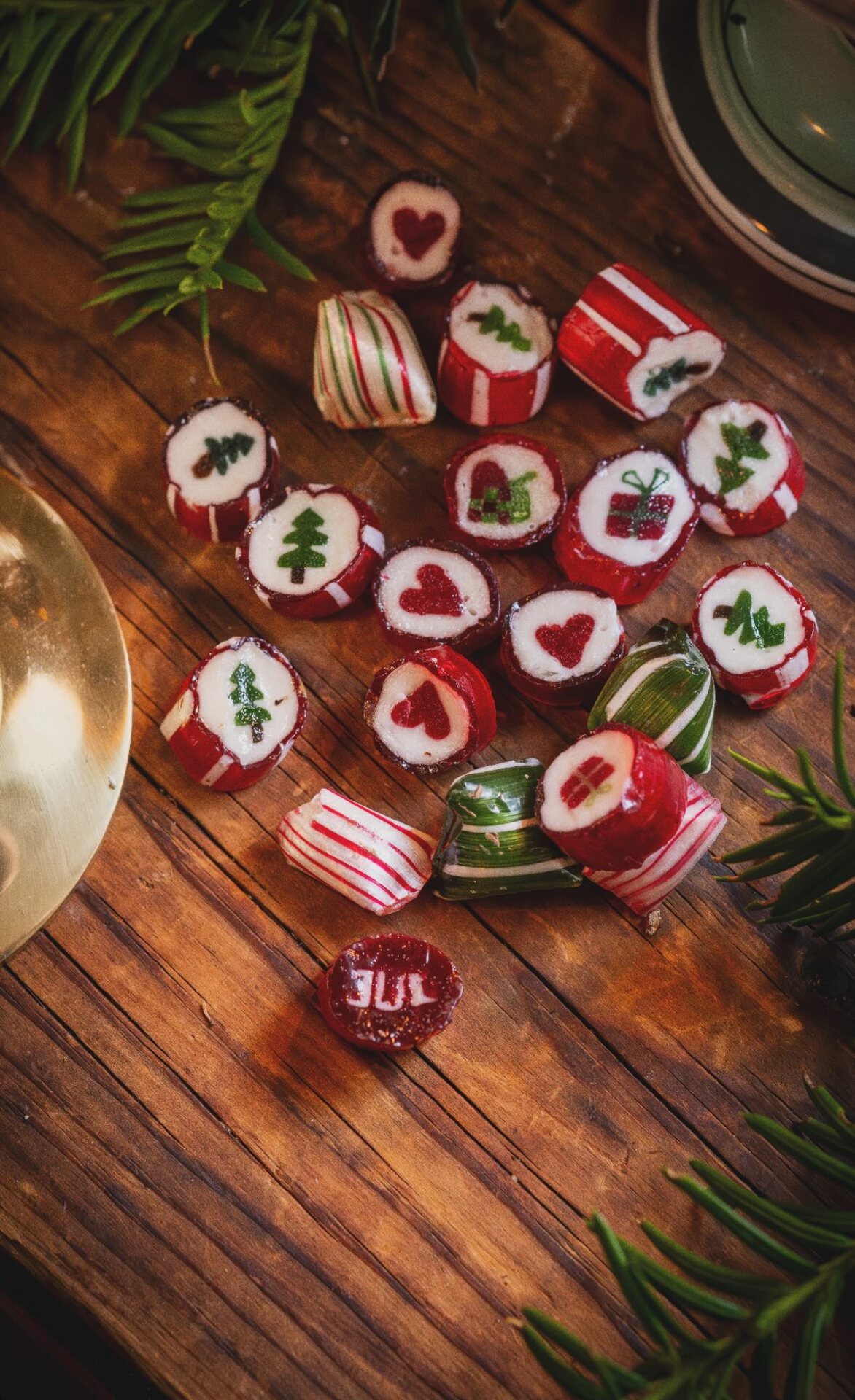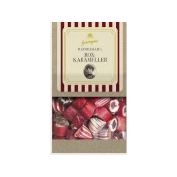 Sockerbagerietin perinteiset, kovat Mathildan Rox-karamellit koreilevat joulun väreissä.