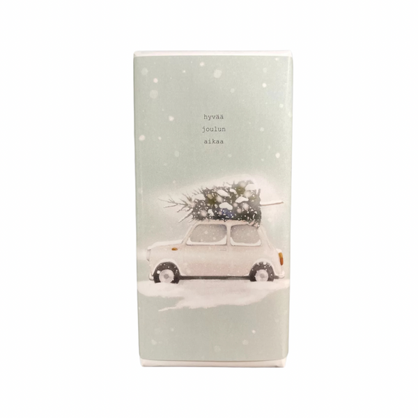 Herkullinen maitosuklaalevy on pakattu kauniiseen Henna Adelin kuvittamaan kääreeseen. Vihreänsävyisessä kääreessä on joulukuusi minin katolla sekä teksti "Hyvää joulun aikaa" .