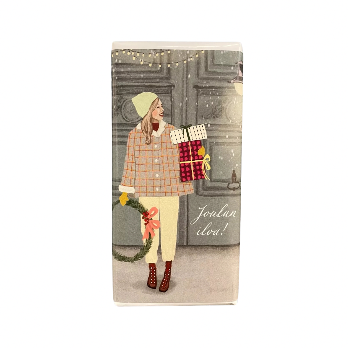 Herkullinen maitosuklaalevy on pakattu Johanna Ilanderin kuvittamaan kauniiseen kääreeseen. Kääreessä on tyylikäs nainen lahjaostoksilla sekä teksti "Joulun iloa!" .