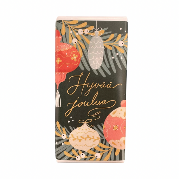 Herkullinen maitosuklaalevy on pakattu Kaisu Sandbergin kuvittamaan jouluiseen kääreeseen. Kääreessä on kuusenkoristeita sekä teksti "Hyvää joulua" .