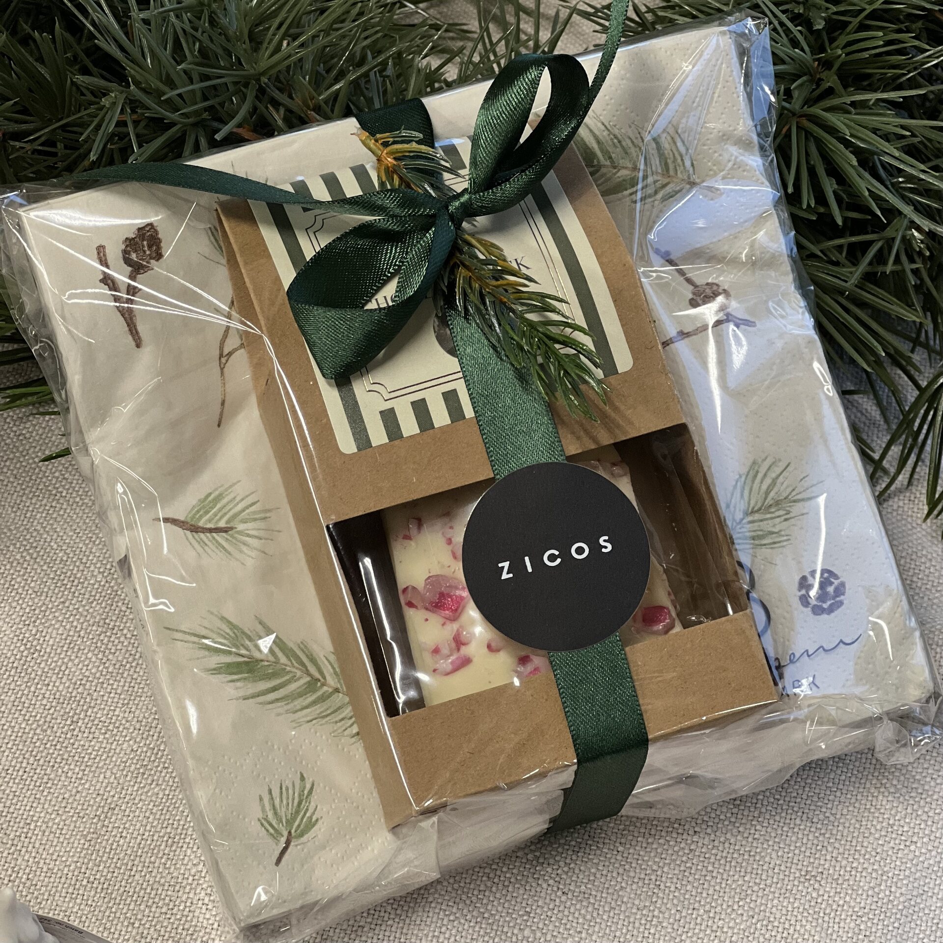 Tämä lahjapakkaus sisältää kauniit servetit havuilla ja kävyillä sekä suussasulavaa piparminttumuruilla maustettua valkosuklaata. Kaunis sellofaaniin kääritty lahjapakkaus on ilo antaa ja saada lahjaksi!
