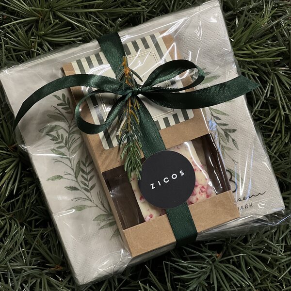 Tämä lahjapakkaus sisältää kauniit vihreänsävyiset kranssikuvioidut servetit sekä suussasulavaa piparminttumuruilla maustettua valkosuklaata. Kaunis sellofaaniin kääritty lahjapakkaus on ilo antaa ja saada lahjaksi!