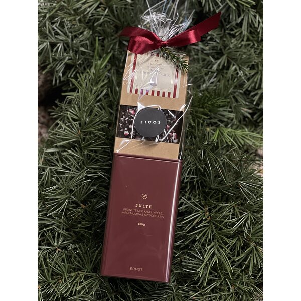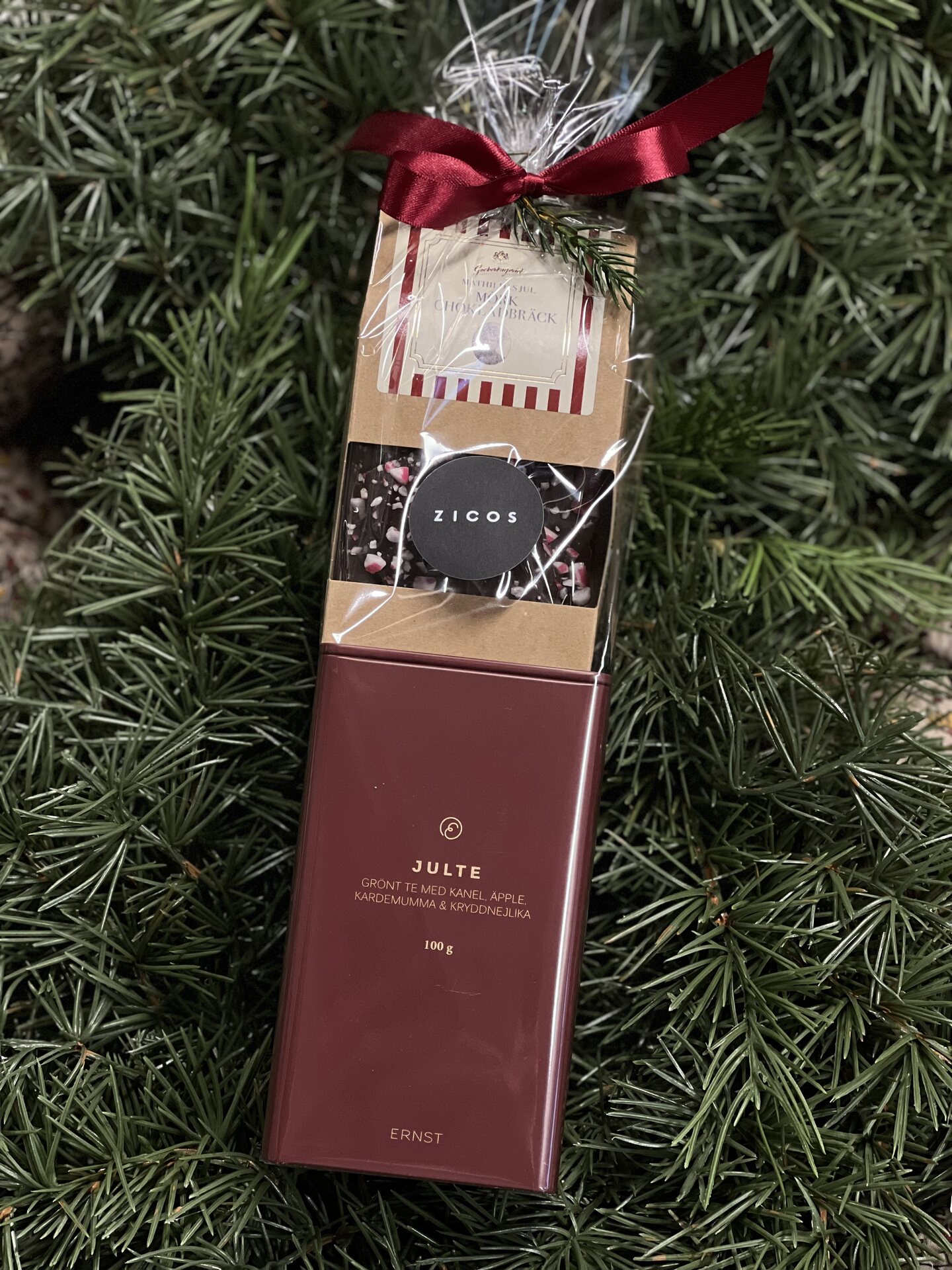 Tämä lahjapakkaus on herkuttelijan mieleen. Tyylikäs jouluinen lahja sisältää ERNSTin peltirasiaan pakattua, kanelilla ja omenalla maustettua vihreää teetä sekä Sockerbagerietin täyteläistä tummaa suklaata, jota raikastavat piparminttumurut.
