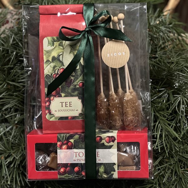 Tämä herkkulahja sisältää tuoksuvaa, mustaa jouluteetä ja piparkakun makuista toffeeta ihanan jouluisissa pakkauksissa. Mukana on myös ruokosokerista valmistetut kandisokeritikut, jotka ovat kuin lusikallinen makeaa kuuman juoman seurana. Kiteytetty ruokosokeri kauniissa puutikussa näyttää ruskealta kristallilta.