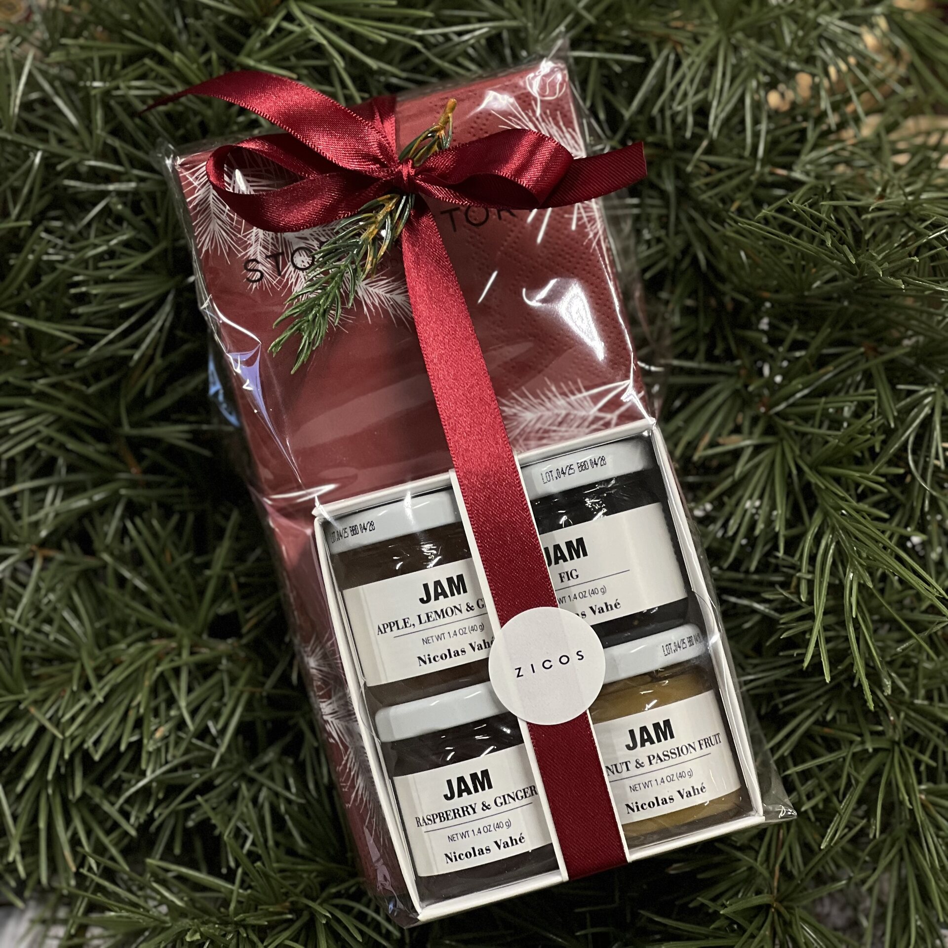 Tähän herkuttelijan lahjaan on pakattu Nicolas Vahen minikokoiset hillot, jotka maistuvat esimerkiksi juustojen seuralaisina. Lahjapakkauksen täydentävät Storefactoryn punavalkoiset, havukuvioiset servetit.