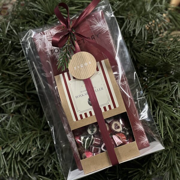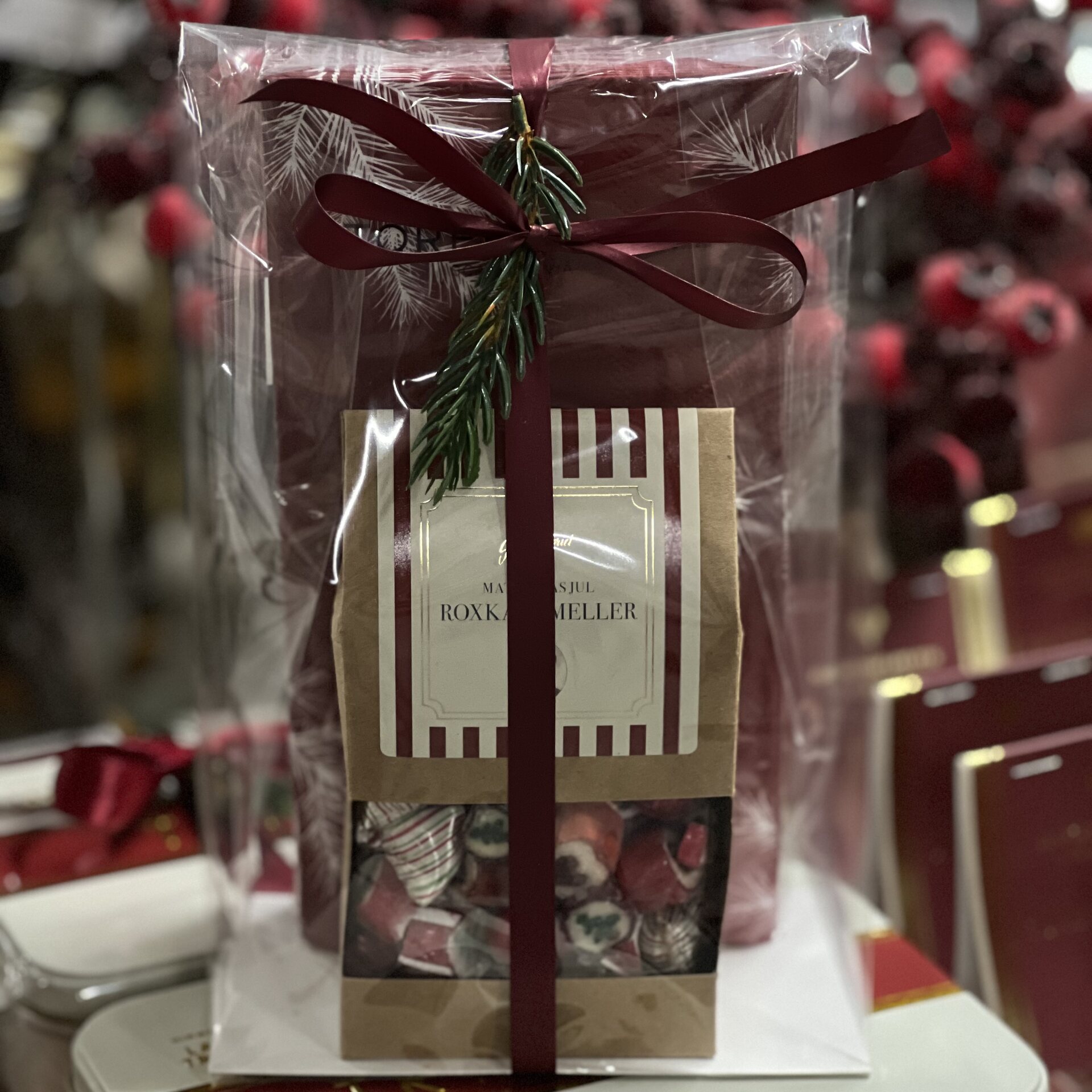 Kivaan lahjapakkaukseen on kääritty Sockerbagerietin koreat, kovat Mathildan Rox-karamellit sekä Storefactoryn jouluiset, punavalkoiset Vintergran-servetit.