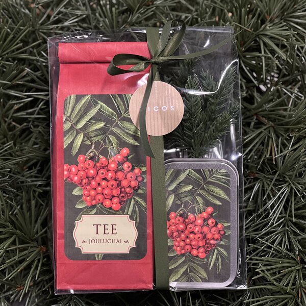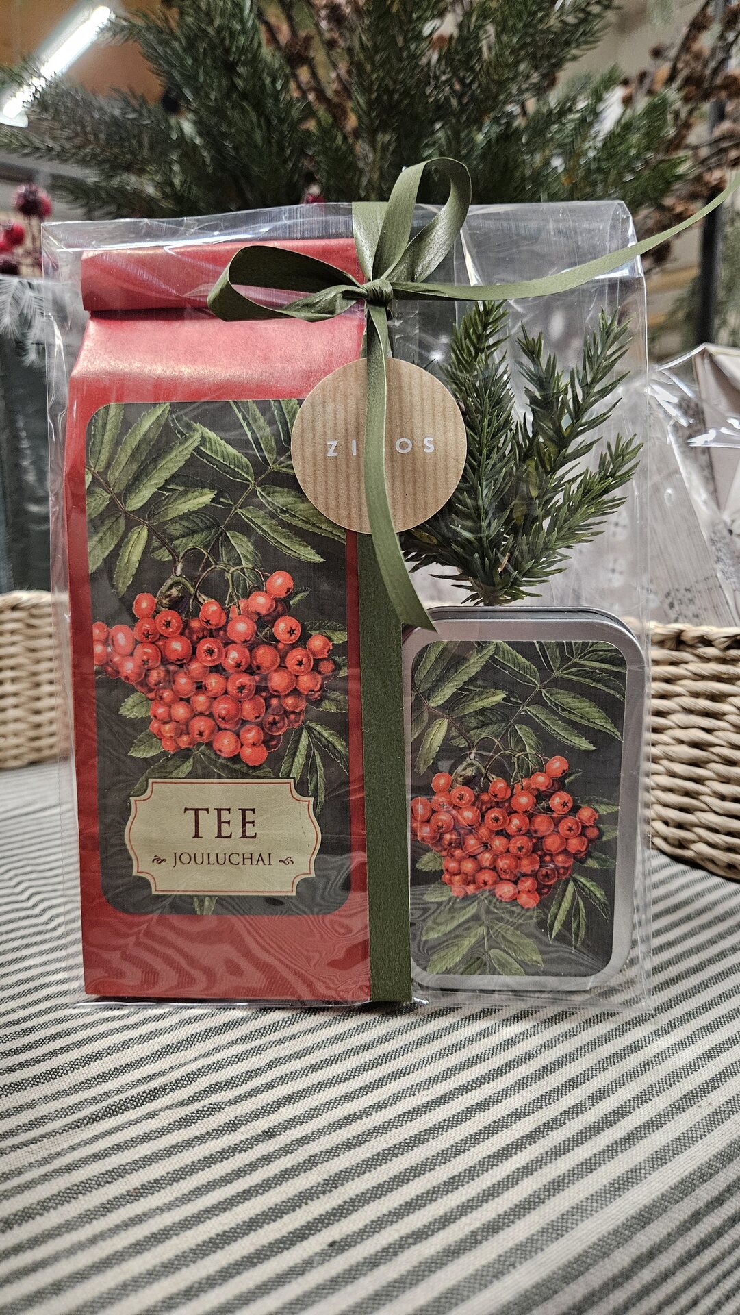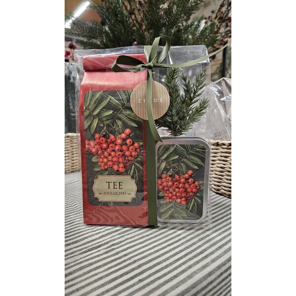 Tämä jouluinen lahjapakkaus sisältää Sköna Tingin klassisilla joulumausteilla maustettua mustaa teetä sekä kauniiseen peltirasiaan piilotettuja piparminttupastilleja. Lahjaa somistaa pieni havunoksa.