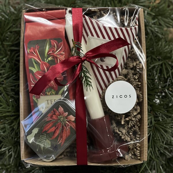 Kaunis sellofaaniin ja koriin kääritty lahjapakkaus, missä on jouluista teetä, nekkutoffeeta, piparminttupastilleja ja kynttilänjalka.