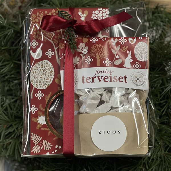 Kauniissa sellofaaniin käärityssä lahjapakkauksessa on Kanelimamman hedelmämarmeladit sekä suussa sulavaa voitoffeeta. Molemmat ovat jo itsessään kauniissa paketeissa.